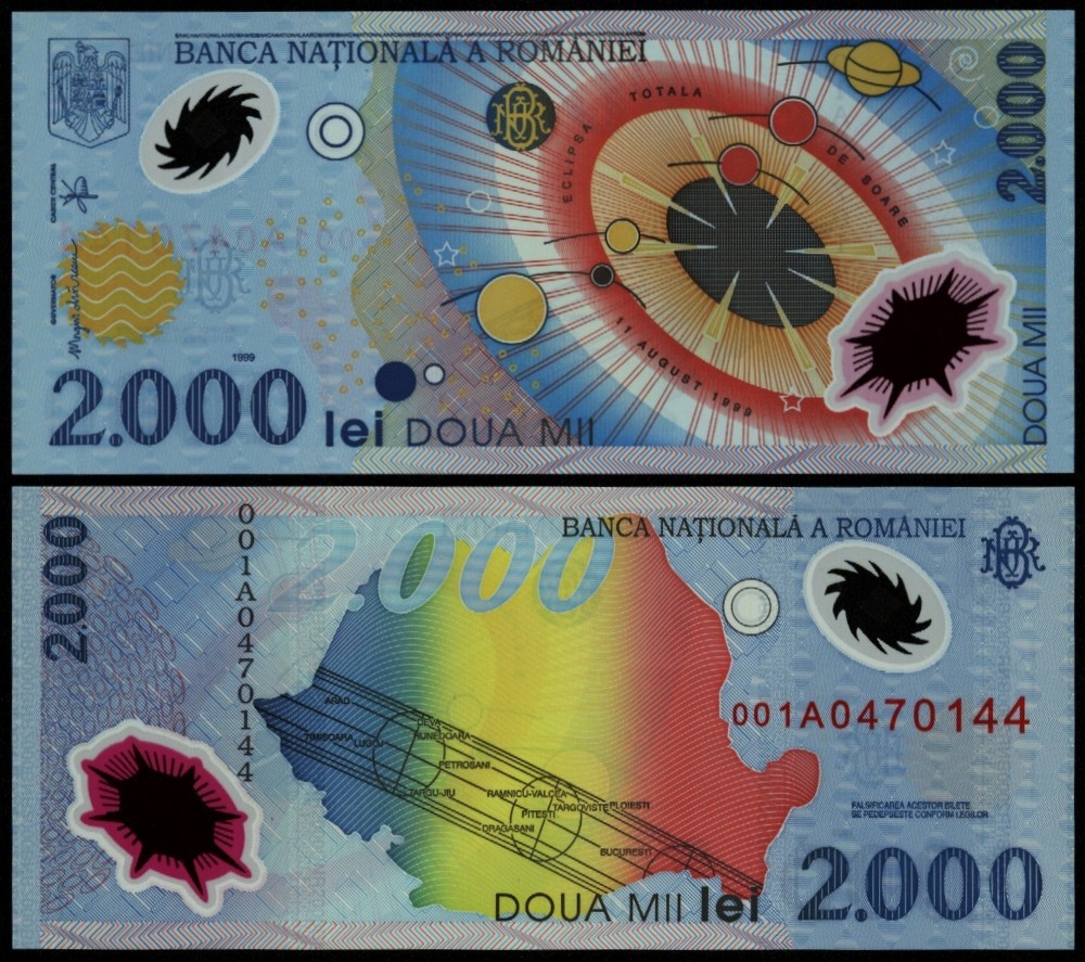 Se livrează în pliant original emis de banca națională a. Eclipsa de soare din 1999 a fost un fenomen extrm de mediatizat în țara noastră. Bancnota aniversara eclipsă de lună. Bnr a evidenţiat eclipsa de soare din 11 august 1999 prin emiterea unor bancnote speciale, de 2.000 de lei, cu inscripţii ce colecţionarii sunt interesaţi să cumpere în special exemplarele care au seria 001axxxxxxx. Această bancnotă a avut o viaţă scurtă
